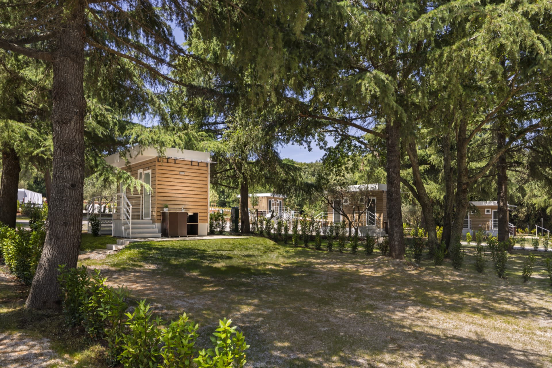 Pitches up to 120 sq. m, each with a private, air-conditioned bathroom featuring a washbasin, toilet, and shower. All pitches are equipped with water and electricity hook-ups, as well as an additional outdoor unit that includes a sink and a mini fridge.